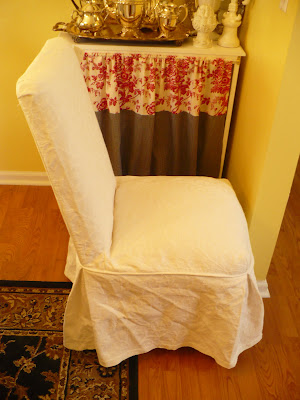 I picked one up – they’re white Parson’s chair slipcovers. At first I thought they were the kind that tie on but they’re not!