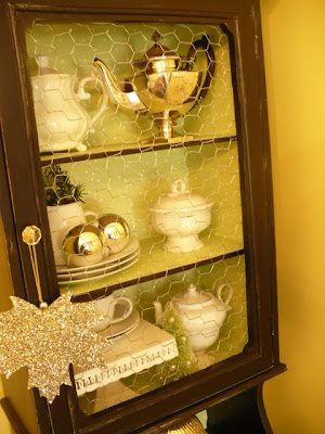 I added a few shiny touches to my little black china cabinet. Usually it just has white china in it but I really like the silver so I may just add a bit more after the holidays are over!