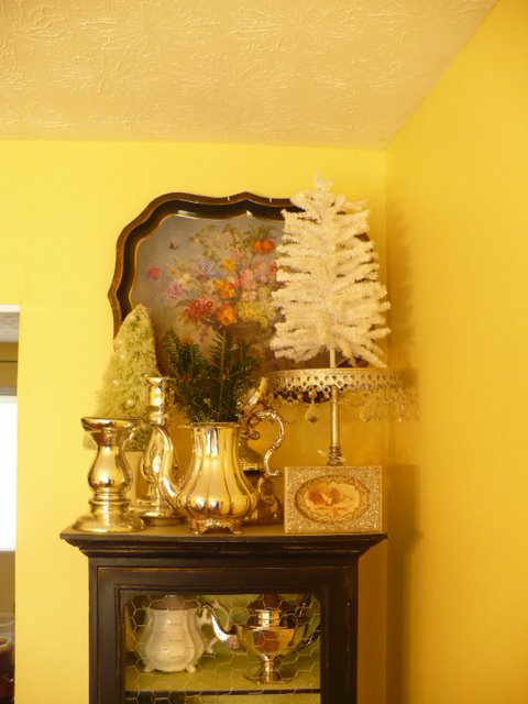 Your black cabinet looks so pretty. I love all of the silver, just beautiful! You have a great eye for vignettes! The tray is so pretty and I love the Christmas trees, the candlesticks and the gorgeous vintage coffee pot your sweet husband gave you. The big silver leaf is lovely and goes perfectly hanging on the knob. I can see why that is your favorite room. I look forward to seeing more.