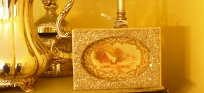 I love that little picture in the glittery frame. I have lots of antique Christmas postcards that would look great framed. Do you suppose I could glitter up some frames or maybe just a mat? My mind is churning!! Thanks for the inspiration. Sally