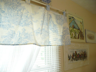 MMMMMmmmm….love the blue toile. Of course, I just love toile anyway! The plates look great above the windows and your tieback? How nifty! I just can't wait to see the whole room! I hope you are having a great week!