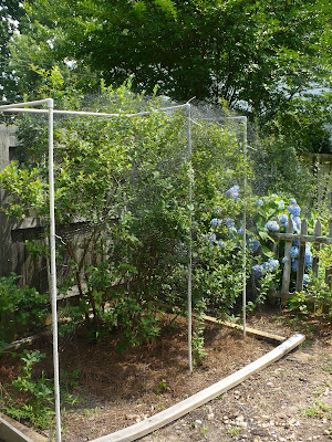 This is the way we protect our blueberries from the birds. These are our two largest bushes. This is just PVC piping used as a frame and then we put bird netting around that and hold it down with some wood. If we didn’t do this we’d never get any berries! Those birds are clever. Every now and then we find one that’s smart enough to get in!