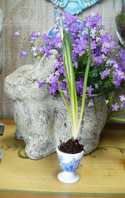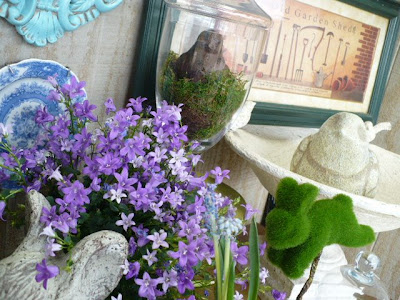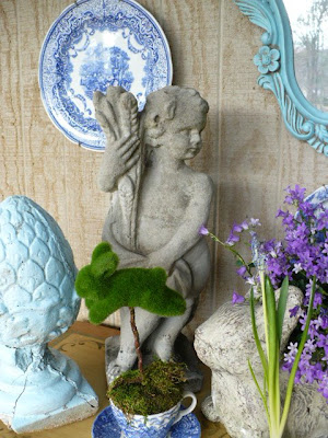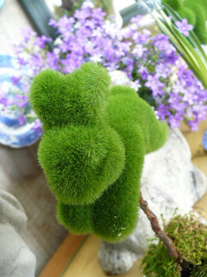 I made these bunny on a stick topiary cups (thank you Angie for posting about the moss bunnies – otherwise I wouldn’t have know as I hardly ever go to Pier One). $2 people, for cute bunnies on a stick (sounds like something to eat doesn’t it)! I just took one of my blue transferware tea cups and filled it with floral foam, topped it with some moss and stuck the bunny in it!