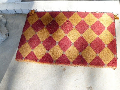 Today I’ll just show the check & harlequin patterns. The first thing you see is that red harlequin door mat outside on my front porch. Then when you enter you see this black check doormat. The risers say “There’s No Place Like Home”, for those of you who haven’t seen the steps before.