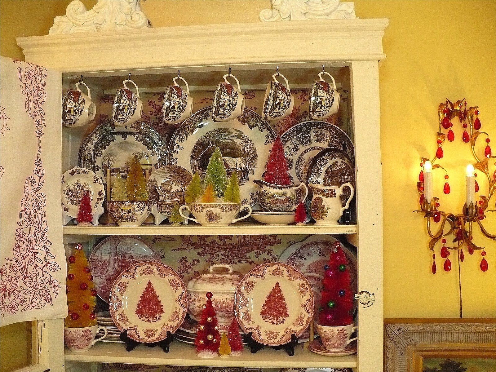 How festive and elegant does the cabinet look with the darling trees and that china. Love it!