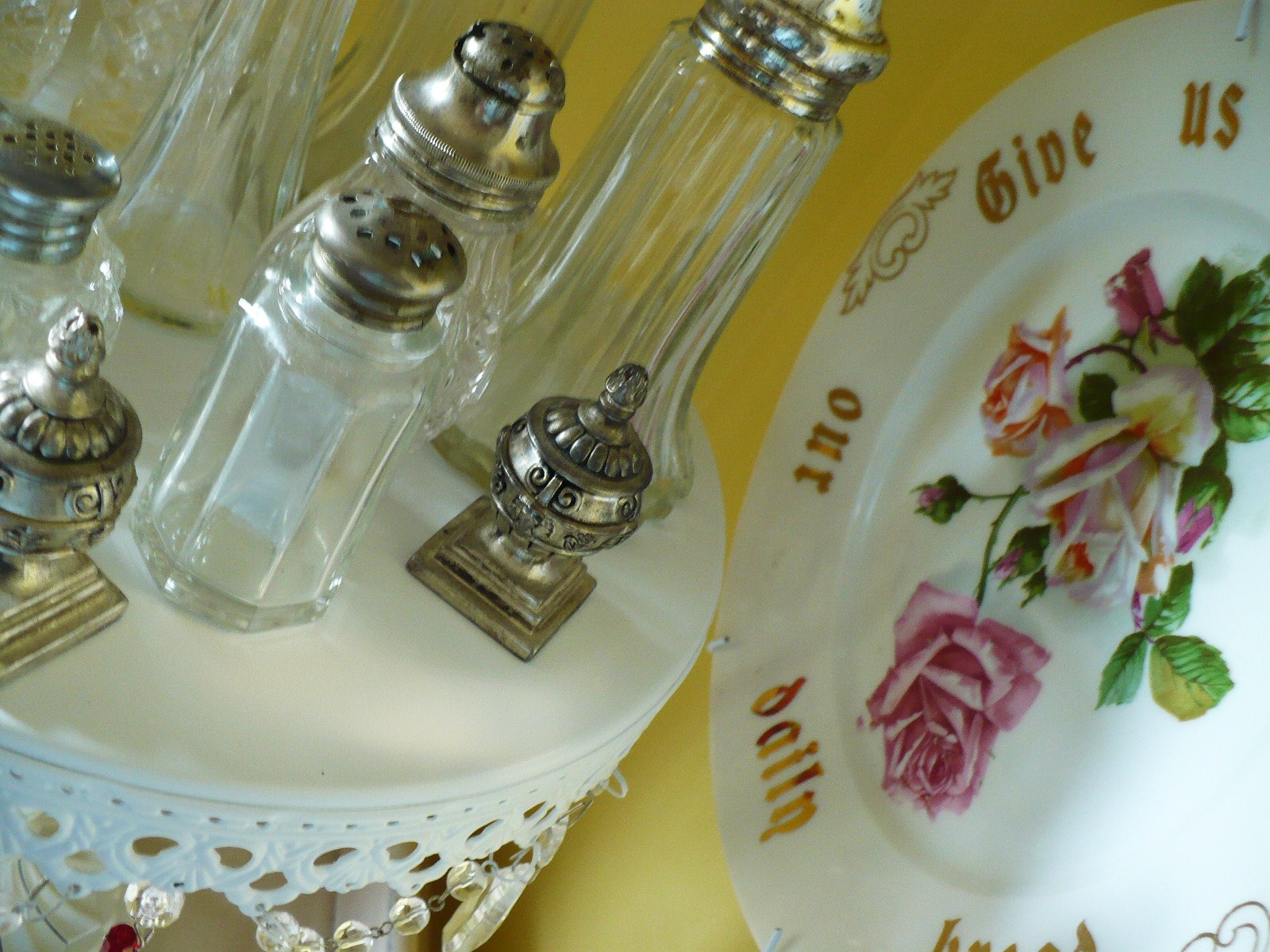 The s&p shakers are great. I love how you have them displayed so pretty on the cake stand. And I really like how you fixed the cake stand for your purpose. I really do need to experiment a bit more!