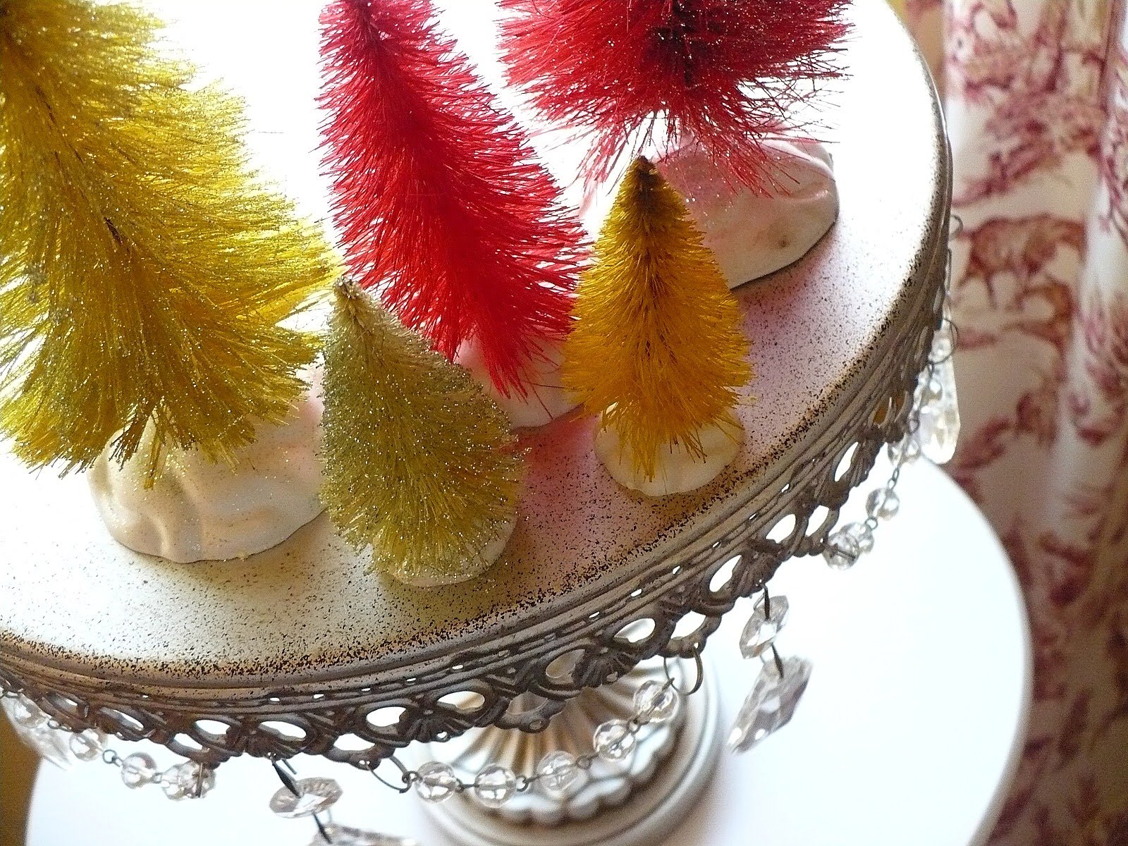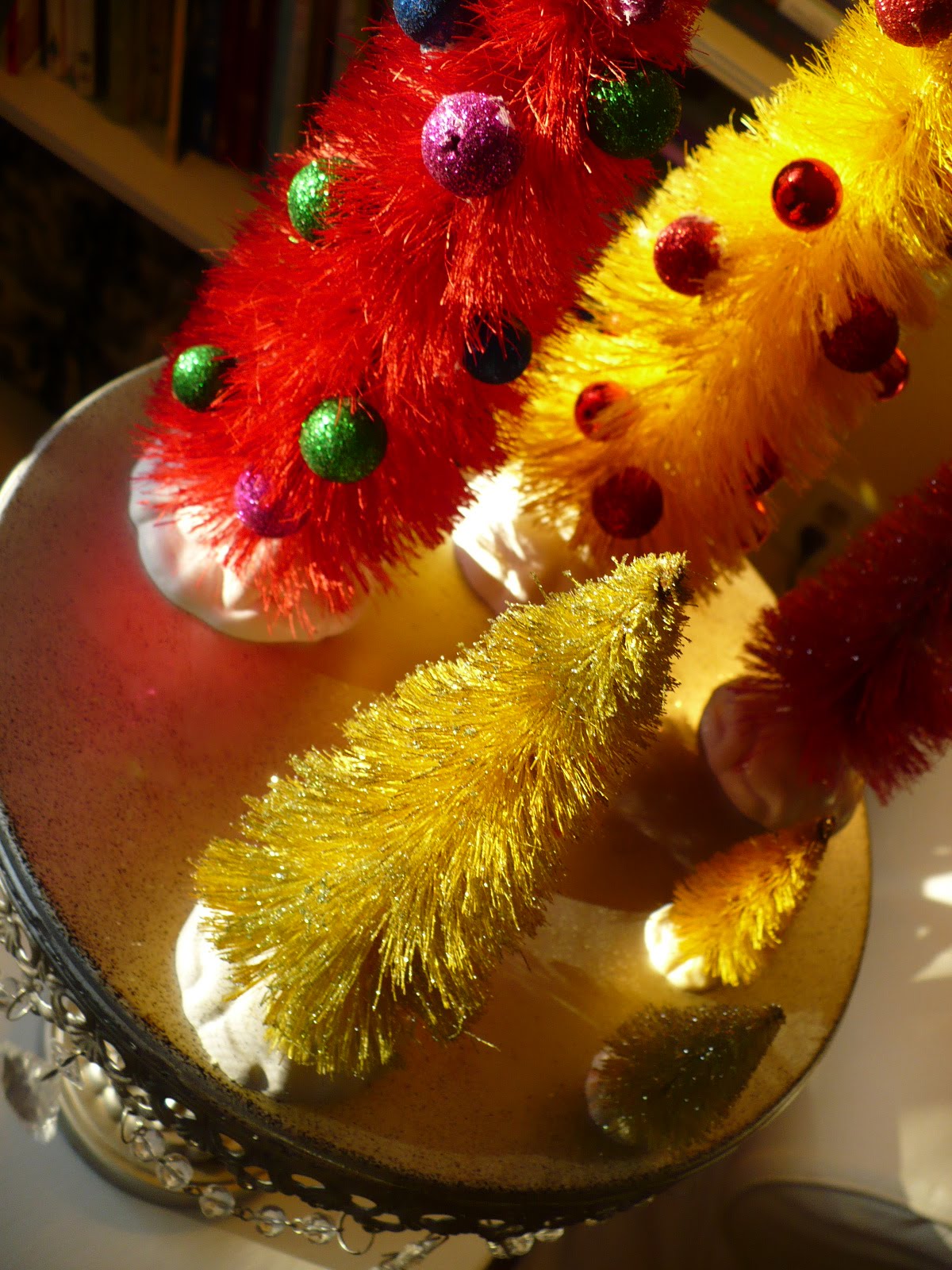 Manuela, this is absolutely darling! I just love to look at your yellow and red bottle trees on your pretty tray!