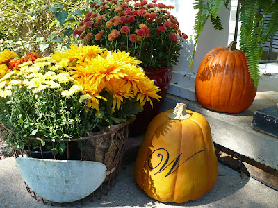 Those stenciled pumpkins look so pretty! I have the "brown" mums right now. Not very pretty! I think I'll get some silk ones too. It's too cold here for the real ones.