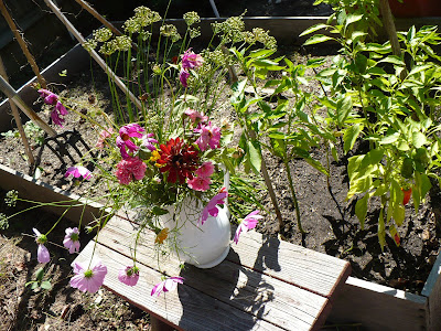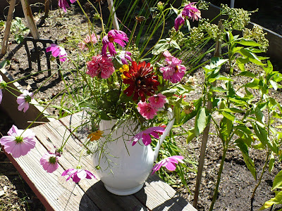I just came in from putting my summer garden to rest and adding some compost before planting a few fall crops. So, it was very timely to read your post. The bouquet you picked to keep you company while you worked is very pretty. Also I adore that picture of your canine helper in his nest. So cute!!