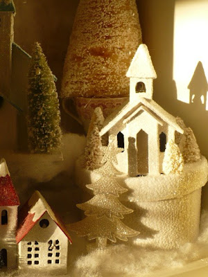 What a LOVELY Glittery Snow Village! Very sweet with a wonderful old-fashioned feel – I love the older ornaments like the little cottage & church! And I love glitter! Very pretty!