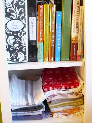 There’s a little bookcase I got at Target years ago that sits under the bulletin board and on top is the phone and the mail basket. This is what’s on the shelves. The cookbooks I use most frequently and the take out menus on one shelf. Shelf two is all my kitchen towels, and the bottom shelf has the phone books and rolodex.