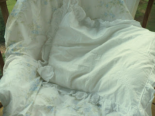A comfy chair with a pretty vintage pillow case from the thrift store.