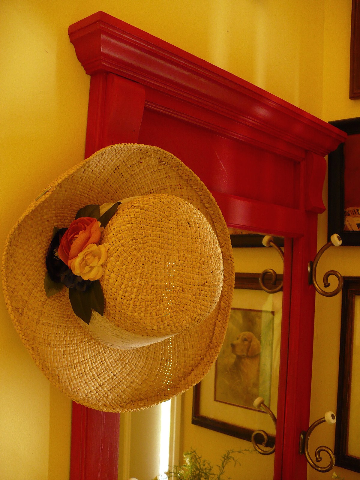 When I bought the halltree I knew I wanted to display vintage hats from the hooks. I found this old one with flowers recently at Goodwill and just love the summery look it gives this piece!