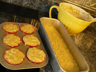 Mix together all the ingredients until just blended. You can now add chocolate chips if you like, raisins, craisins, nuts etc. Then pour into loaf pans or muffin pans.I made six muffins and one loaf with this recipe.