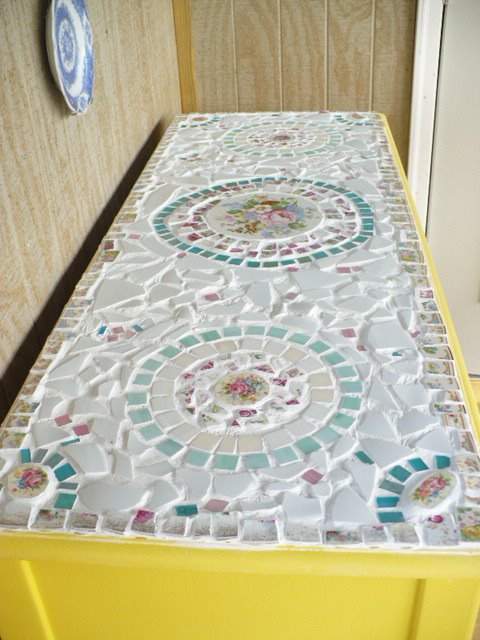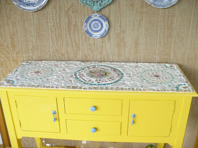 Some of you may remember when I painted my buffet yellow I said that I’d like to mosaic the top…Well I did it!