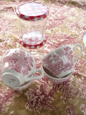Most of you know I collect red transferware. I have a lot of plates but I only have 3 cups. So what do I see at the thriftstore….