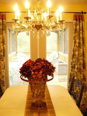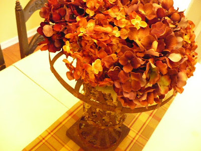 I love the Roosters! My kitchen is covered in them. The urn with the bronze color? hydrangeas is wonderful on your table. I need to go shopping with you, you can really find some deals. The urn you can pass on to me when you have worn it out. lol