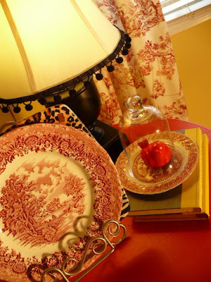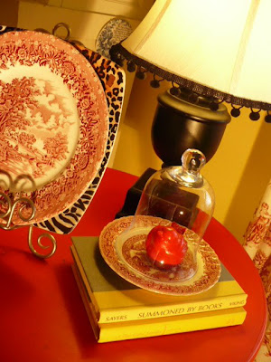 I found a plate with various animal prints on it at TJ Maxx for $3.99 and I stacked one of red transferware plates in front of it.