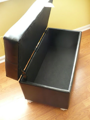 This is not my makeover for today. This is an ottoman I made about 10 years ago and I’m surprised it’s held up as well as it has! The previous owners left an old Naugahyde ottoman in the house when we bought it and I just added another layer of foam to make it higher and some fabric & fringe. Well, I’ve been wanting a storage ottoman for a couple of years now. I’ve seen them for anywhere from $129 to $79 and that was more than I wanted to spend. Fortunately Target had some on sale a few weeks back for $59 so I snatched one up!