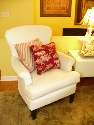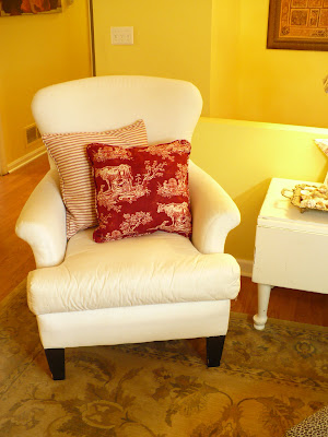 Hi Manuela!! It is adorable! The the chairs and I'm sure your chair is going to look great slipcovered in red toile. Needless to say I loooove the pillows!! They're beautiful!