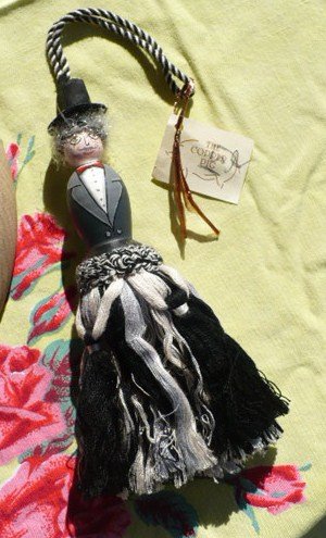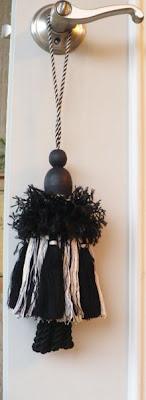 The 52 cent piece of wood painted black became the base for a cloche. I took the hat etc off the tassel and painted it black. Then I added two other bits of trim from my stash and now I have a nice big tassel for under $2!