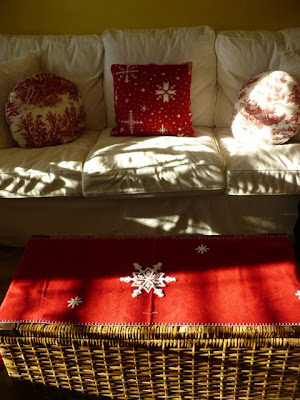 But first I wanted to show you a table runner I got at TJMaxx for 70 cents! I think it may have been marked wrong because the placemats were marked down to .70 but most of the runners were $2. But maybe not since it’s a Christmas runner. Anyway, It reminded me of the pillow I made out of an old sweater that’s on my couch.