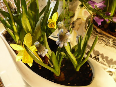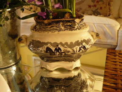 I’ve planted various Paperwhites and Jonquils in this black transferware tureen all winter