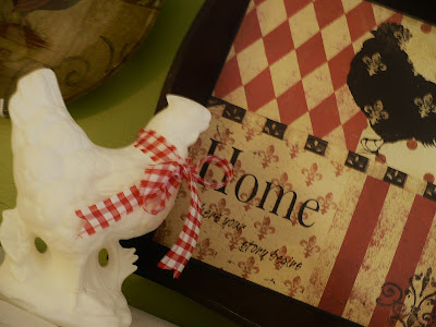 I saw those very same plates today at hobby lobby! I didnt get them now seeing this I wised I had! lol..I luv what you have done there..I also have chickens and roosters in my kitchen..I really luv that little red pail! very pretty manuela!