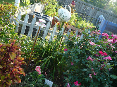 Oh! I love the addition of the teapot!!!! I have a cup/saucer. I used a piece of porch railing for the base and then drilled a hole through the cup and saucer with a bit especially made for chine. Then screwed the cup/saucer to the porch railing.