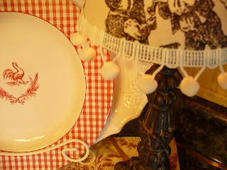 I love the lampshade makeover! It looks great! I went to Hobby Lobby this weekend, I checked out the price of the black toile fabric. I said what!!! Too high! I was thinking of having it in my bedroom! I got the thread, ready to make my blue toile fabric into things! Those 20 + yards have been here for at least 5 or 6 years! I bought it on sale. Hope you find some black toile on sale for your stash! Love your daughter reused the canvas. I have a picture in my scanner waiting to email to you. Hubby got to get in the back on the floor to unhook my camera, to scanner. I would never get up! I found the French plates and fell in love, the the black transfer! I kept telling myself, you have enough dishes, just buy the salad plate and make a different table setting! After getting home, I had some extra money come in, If I could have gone back I bought the dinner plate. I stayed in bed a week from that outing! lol
