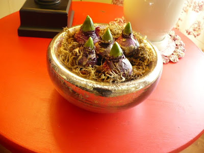 I put all my flowering bulbs and an ivy plant together on a pretty silver tray and created a little portable indoor garden for myself!