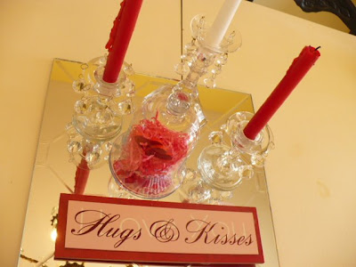 So pretty! I love what the mirror added and the hugs and kisses. Such a LOVE~ly vignette for Valentines Day. Your family is sure lucky to have you!
