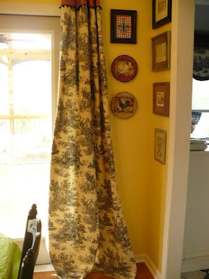 I love your toile. I have the same black and cream drapes in my kitchen and I am considering adding fabric and fringe to the top, too!